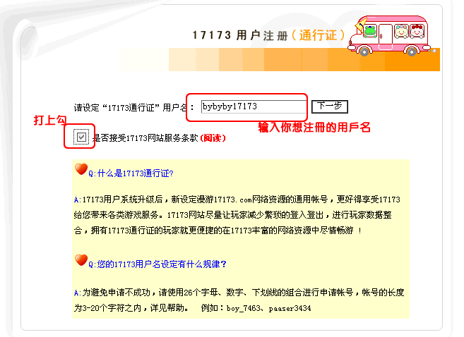 3.输入您想要的用户名,勾选下面的“是否接受17173网站服务条款(阅读)”点击下一步。